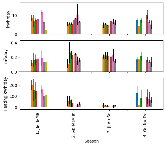 Übersicht Verbrauch Strom (kWh), Wasser(m3), Heizung (kWh, von Öl) über mehrere Jahre. Besondere Ereignisse sind sichtbar, wie ein Heizungsausfall und Ersatz durch elektrische Wärmequellen, der Bruch eines Wasserschlauchs, elektrischer Mehrverbrauch im Coronawinter.