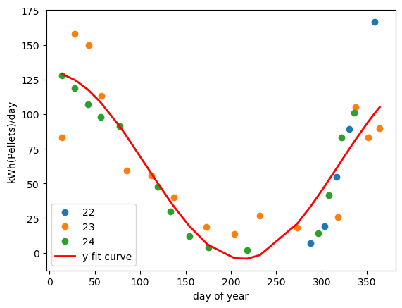 Jährliche Verbrauch an Wärmeenergie von Pellets. Eine sigmidale Kurve fittet den Verbrauch mit einer geschätzten Frequenz von 365 Tagen.