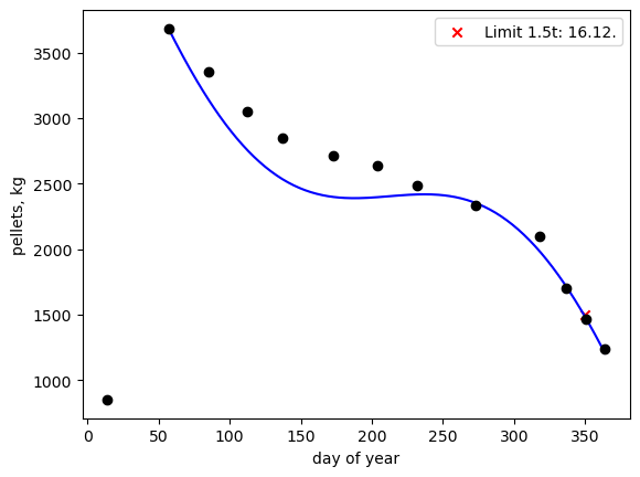Auf Basis der sigmoidalen Verbrauchsanpassung wird der Füllstand des Pelletbunkers vorhergesagt (blaue Linie). Die gemessenen Füllstände (schwarze Punkte) sind Abschätzungen des Verbrauchs aus dem Aschegewicht nach bestimmten Intervallen. Der optimale Zeitpunkt zum Wiederbefüllen ist durch das rote Kreuz markiert.