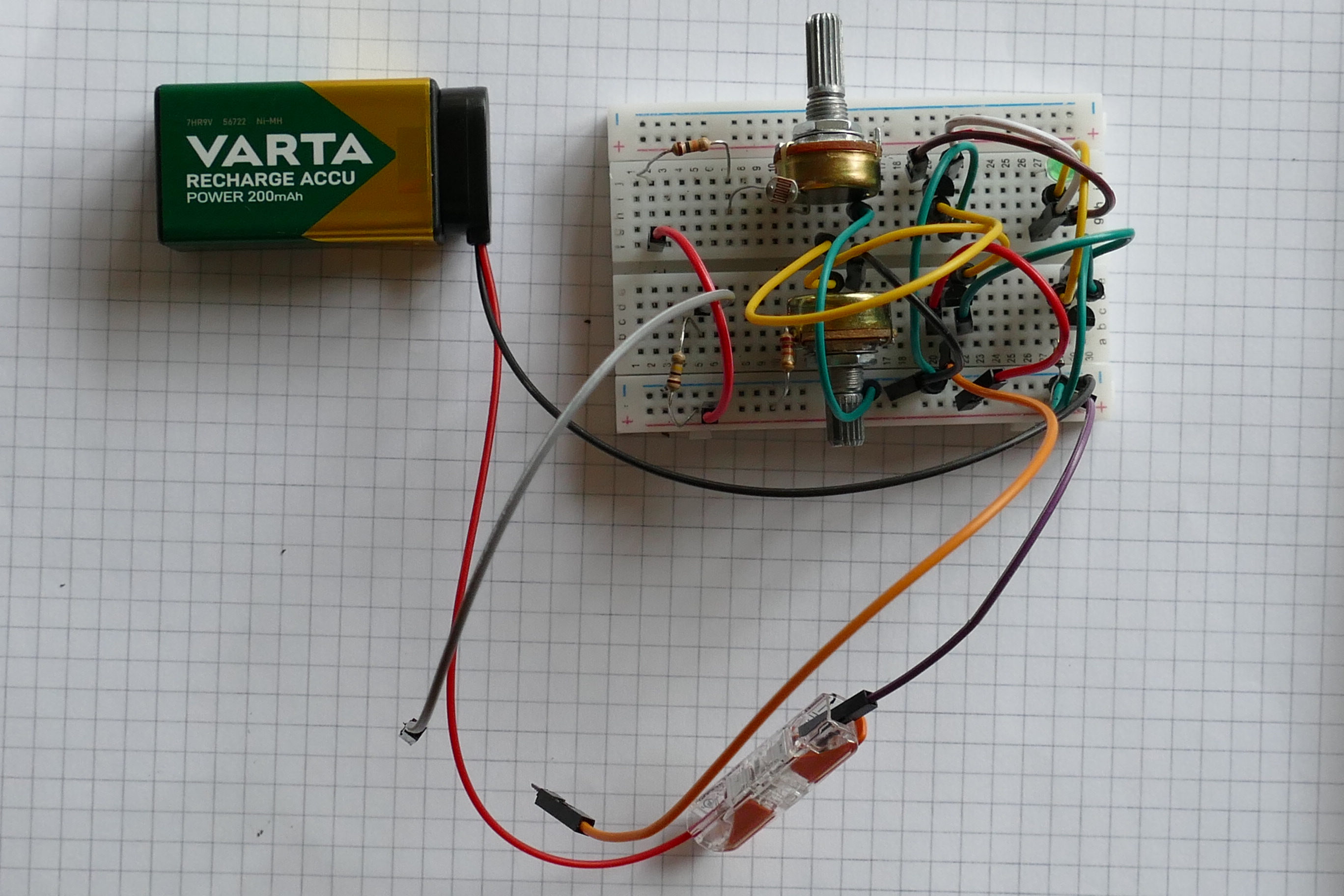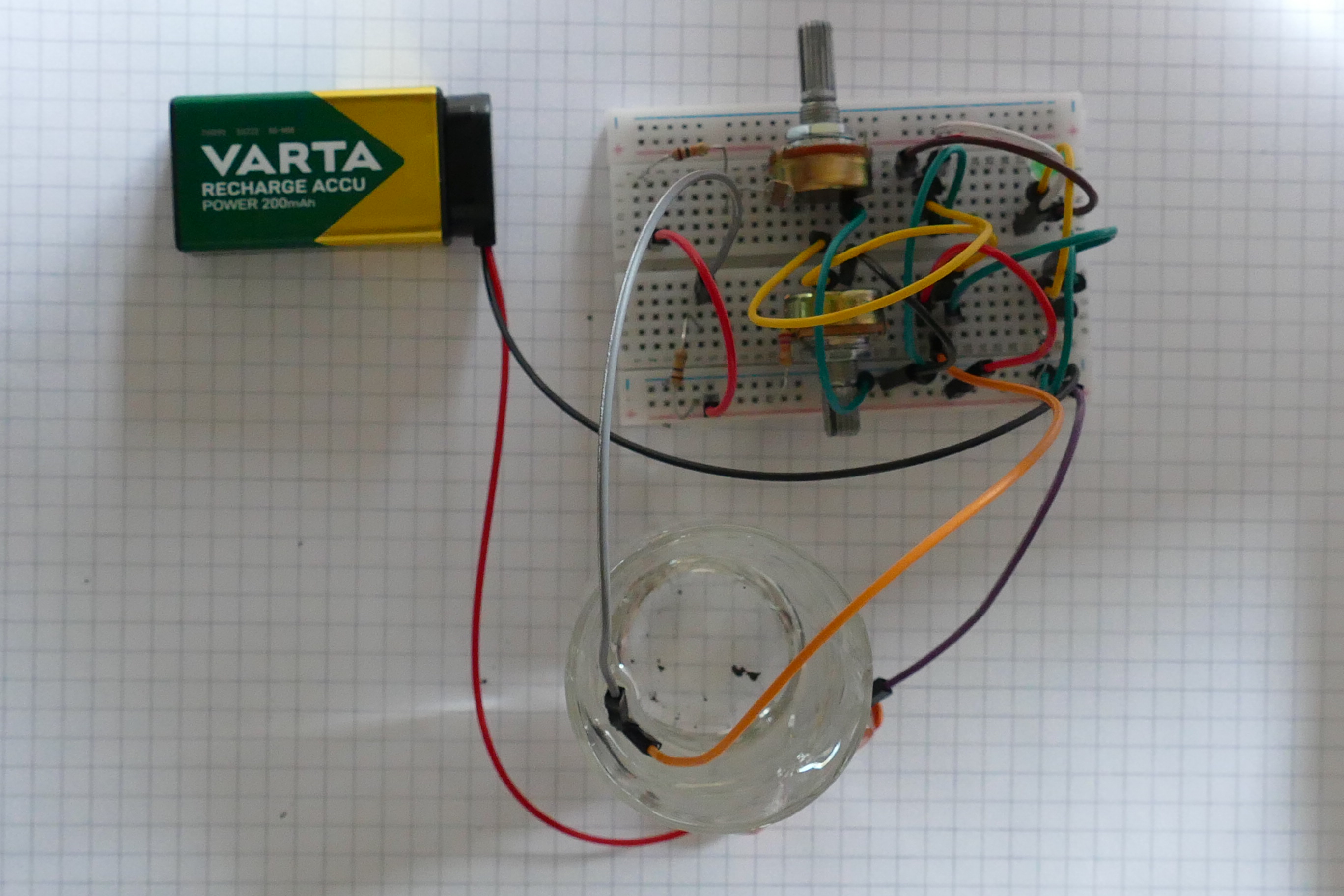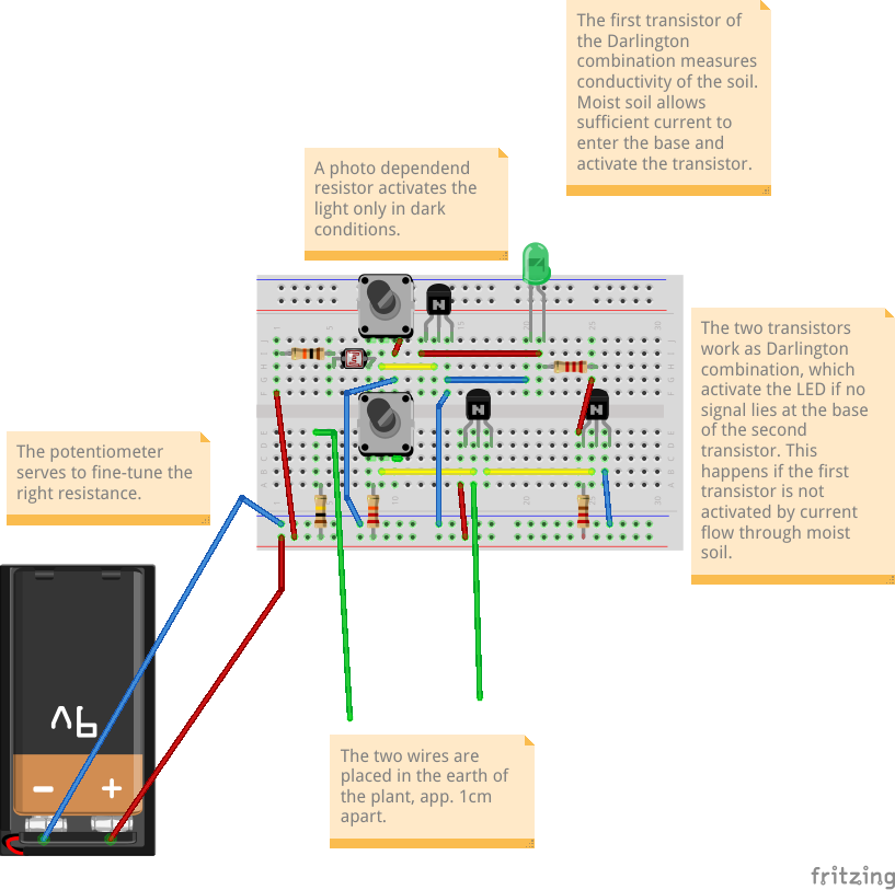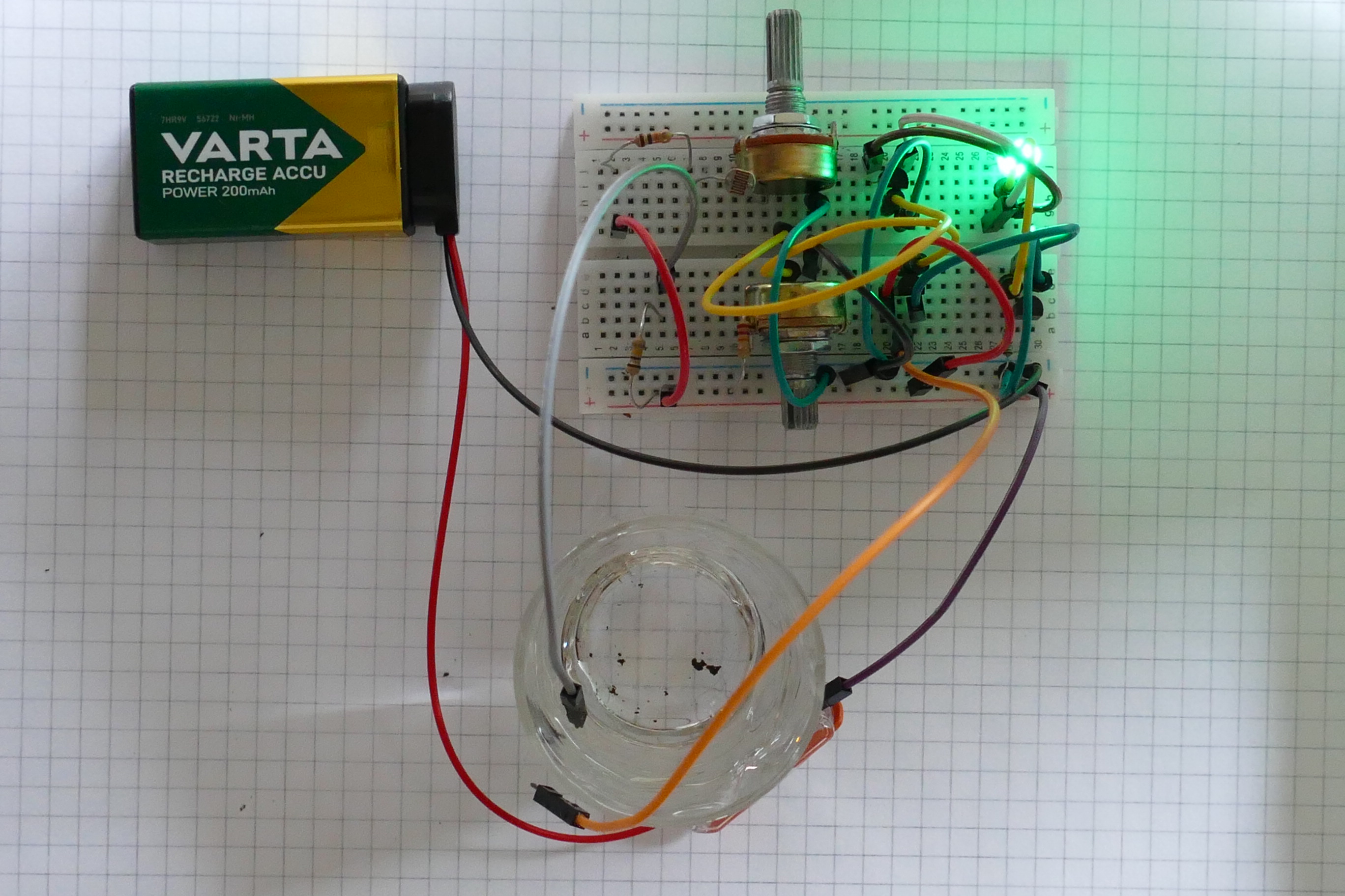 Wir haben in der Familie die Gießaufgabe auf den Sohn verteilt. Jedoch schafft er es nicht immer rechtzeitig dieser kleinen Aufgabe nachzukommen. Der Papa möchte seinem Sohn natürlich mit einem technischem Gerät helfen: einem Sensor, der anzeigt, wann die Erde zu trocken ist. Die Inspiration kommt aus dem sehr eingänglichen und lehrreichen Buch Elektronik ganz leicht, Florian Schäffer, abgewandelt mit einem Lichtwiderstand, damit die signalgebende Lampe auch nur strahlt wenn es dunkel ist.